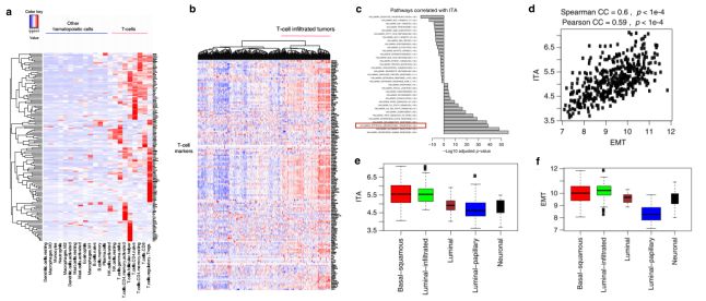 免疫细胞相关标志基因的表达可用于反映肿瘤中免疫细胞浸润的丰度,研究人员对22种不同类型或状态的免疫细胞中免疫相关标志基因的表达进行了分析,结果发现有144个基因在T细胞中高表达(Fig. 1a)。进而依据这144个T细胞相关标志基因在尿路上皮肿瘤中的表达,将其分为T细胞浸润肿瘤和非T细胞浸润肿瘤两种类型(Fig. 1b)。对与肿瘤T细胞浸润丰度(tumor-infiltrating T-cell abundance, ITA)存在相关性的基因和信号通路的筛选分析发现,免疫相关的信号通路(如IFN,炎症和TNF信号通路)与ITA正相关,EMT相关基因的表达也与ITA正相关(Fig. 1c, d)。一些研究表明,尿路上皮肿瘤可根据其基因表达谱进行分子分型,作者的研究发现在不同亚型的尿路上皮肿瘤中,luminal-infiltrated 和 basal-squamous 亚型中的EMT相关基因与ITA均高表达,EMT相关基因表达与ITA正相关(Fig. 1e, f)。