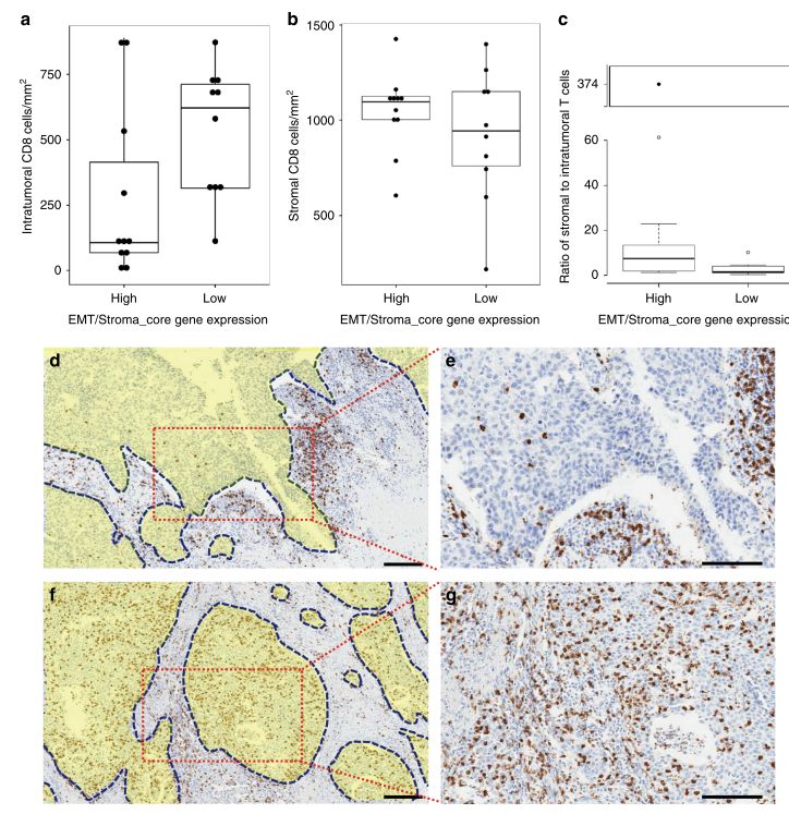 作者认为 EMT/Stroma core基因高表达的CD8浸润肿瘤可能代表了一类具有原始免疫排斥特性的肿瘤类型,在这种肿瘤中,CD8阳性细胞主要分布在基质细胞间,在空间上是与肿瘤细胞分离的。因而,研究者进一步分析对比了EMT/Stroma core基因高表达或低表达的CD8浸润肿瘤中CD8阳性细胞的定位,如Fig. 6所示,EMT/Stroma core基因高表达的肿瘤样本中,肿瘤内CD8阳性细胞明显低于EMT/Stroma core基因低表达的肿瘤,并且基质内CD8阳性细胞与肿瘤内CD8阳性细胞的比值更高。这表明,EMT/Stroma core基因高表达的CD8浸润肿瘤中,CD8阳性细胞与肿瘤细胞被基质细胞阻隔而被迫分离,这可能是其产生免疫抵抗的原因。