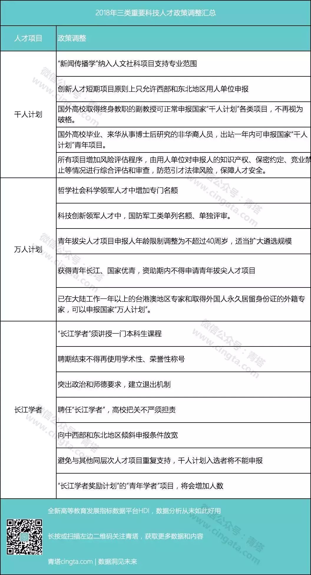 今年比较特殊的是,这几类重要人才计划也都迎来了政策方面的重大调整。根据中组部发布的《中共中央组织部办公厅关关于开展2018年国家“千人计划”“万人计划”申报推荐工作的通知》和最新的《“长江学者奖励计划”管理办法》,具体的政策调整主要主要集中在几方面: