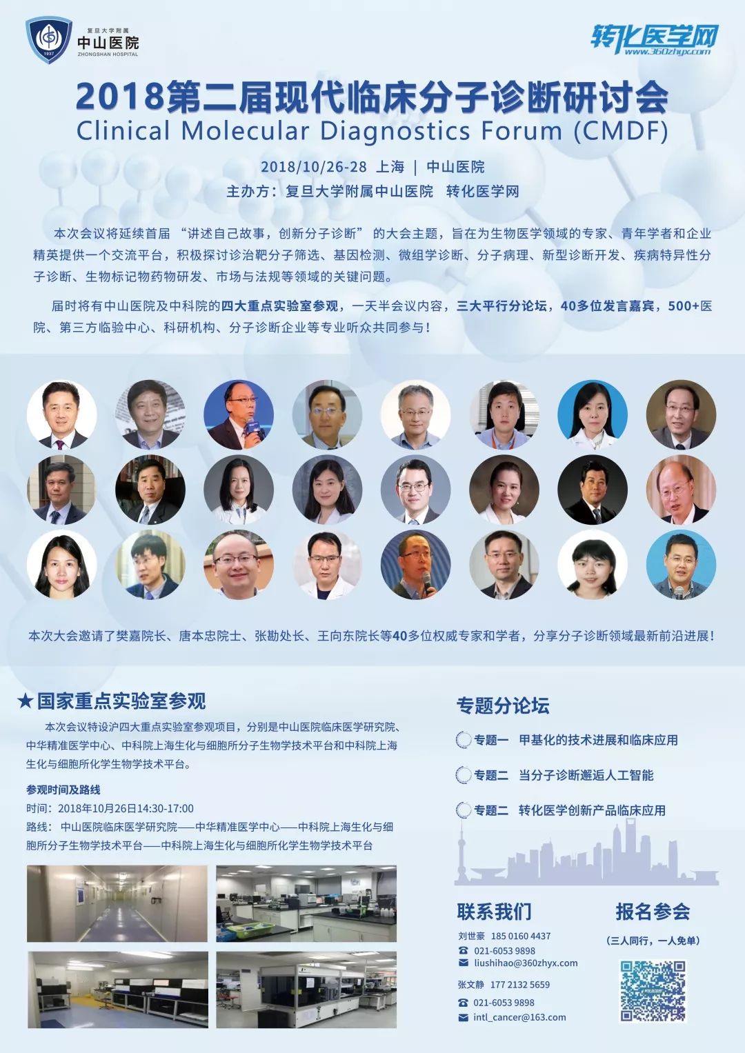 延续首届 “讲述自己故事,创新分子诊断” 的大会主题,2018第二届现代临床分子诊断研讨会(2018 Clinical Molecular Diagnostics Forum CMDF)将于2018年10月26-28日在复旦大学附属中山医院举行。
