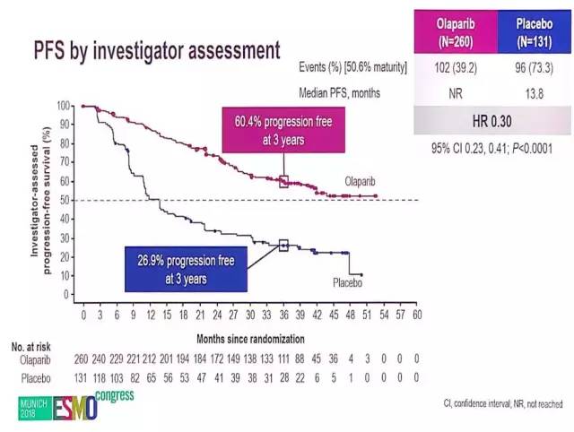 与安慰剂组相比,奥拉帕利组的无进展生存期显著延长,疾病进展或死亡风险降低了70%,安慰剂组中位无进展生存期只有13.8个月,奥拉帕利组在经过长达三年半的随访后,有60%患者没有出现疾病进展,41个月后仍有超过50%的患者没有疾病进展。除了疗效好以外,副作用还小,患者的依从性较高,常见的副作用主要是肠胃道反应,通常不严重,对患者生活质量影响较小。