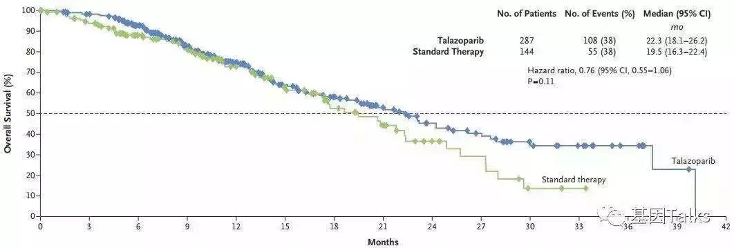 Talazoparib3期试验入组了431名的携带BRCA1/2胚系突变的晚期乳腺癌患者,按照2:1随机分组接受Talazoparib或标准单药化疗(卡培他滨、艾日布林、吉西他滨或长春瑞滨)。Talazoparib组中位无进展生存期(PFS)显著长于标准化疗组8.6个月 VS 5.6个月(HR 0.54; 95% CI; p<0.001);中位总生存期(OS)为22.3个月,长于标准治疗组的19.5个月;客观响应率显著高于标准化疗组(62.6% vs. 27.2%; 95% CI;P<0.001)。Talazoparib组和化疗组试验相关严重副作用发生率均为9%,主要症状分别为贫血和白血球减少;两组常见副作用发生率分别为55%和38%。