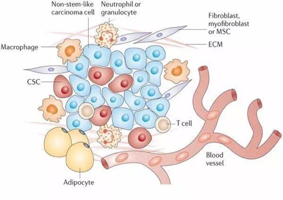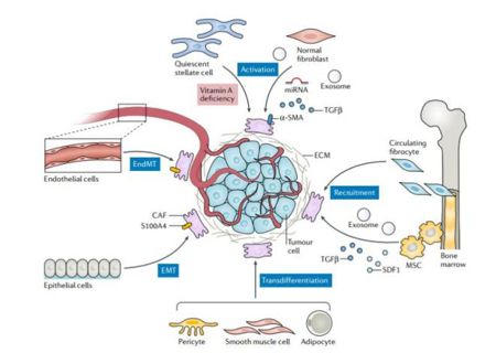 目前以癌症为中心的治疗方法(比如传统的放疗及化疗等),通常不能完全根除恶性肿瘤,因为肿瘤基质可能促使肿瘤复发,并且对治疗产生抵抗。肿瘤基质细胞就是肿瘤生存的微环境(TME),在肿瘤基质细胞中,癌症相关成纤维细胞(CAF)是最丰富的,并且研究证实CAF与癌症进展密切相关。CAF通过细胞-细胞接触释放,来调节肿瘤细胞和其他基质细胞的生物学行为,影响许多调节因子的合成、甚至重塑细胞外基质,因此这些细胞可影响肿瘤的发生和发展。