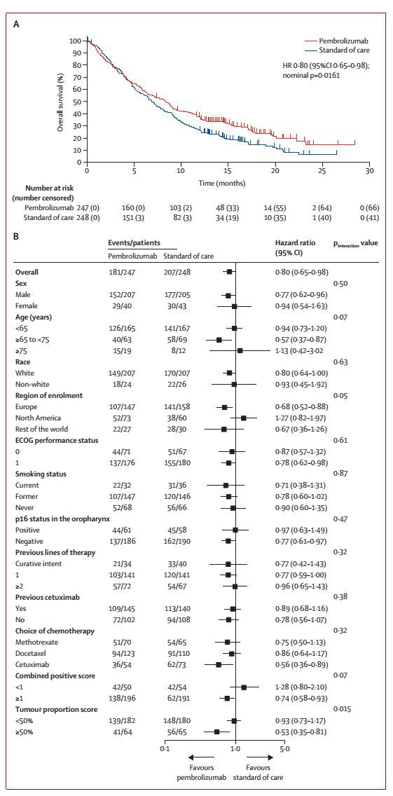 参考文献:The Lancet(柳叶刀)Pembrolizumab versus methotrexate, docetaxel, or cetuximab for recurrent or metastatic head-and-neck squamous cell carcinoma (KEYNOTE-040): a randomised, open-label, phase 3 study , DOI:10.1016 / S0140-6736(18)31999-8