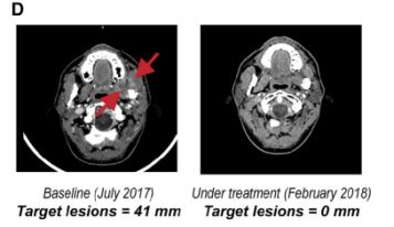 在进行完小鼠试验后,研究人员进行了人体实验,首先他们筛选了31名鳞状细胞头颈癌患者,对其进行了分组,分别使用了不同剂量的NKG2A单抗以及EGFR受体抑制剂cetuximab。最终这31名患者中,8名患者有超过30%的肿瘤减少,14名患者病灶减少50%,病情得到有效缓解,甚至一名患者病灶完全消失了!