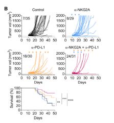 这仅仅在理论层面具有抗癌作用,那么究竟是否有效呢?该研究团队设立了4个实验组,分别研究了单独使用PD-L1单抗、单独使用NKG2A单抗、联合使用PD-L1和NKG2A单抗以及空白Control组。令研究者大吃一惊的是,单独使用NKG2A单抗竟然没有显著的抗癌作用,而单独使用PD-L1单抗则可减少40%的肿瘤组织,但是当联合使用PD-L1和NKG2A单抗时,则可减少75%的肿瘤组织!