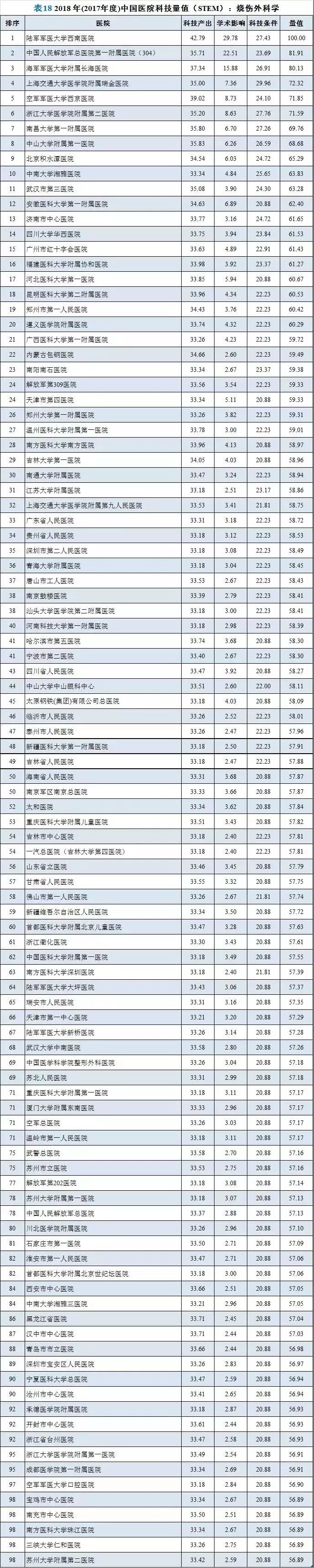 2018年(2017年度)中国医院科技量值(STEM)综合榜单及29个相关专科榜单前100排名: