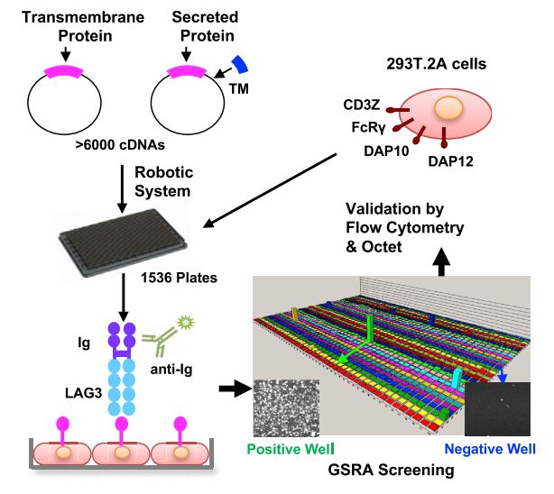这个GSRA技术的原理,是将人类的分泌蛋白加上一个跨膜结构域,使其能在细胞表面中表达,而所要寻找的配体也隐藏在其中。若配体能与带有抗体标签的LAG-3受体相互作用,就能通过抗体引起荧光变化,而这种变化能用激光扫描仪检测到。