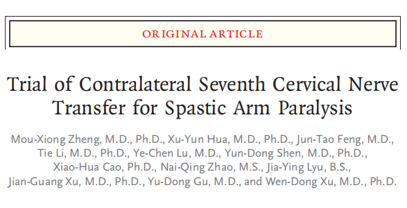 第一篇文章便是来自复旦大学附属华山医院、国家老年疾病临床医学研究中心徐文东教授、顾玉东院士团队“健侧颈神经移位手术治疗中枢损伤后上肢痉挛瘫的临床试验研究”。