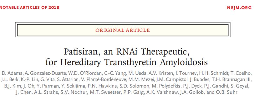 该文题为《Patisiran, an RNAi Therapeutic, for Hereditary Transthyretin Amyloidosis》。