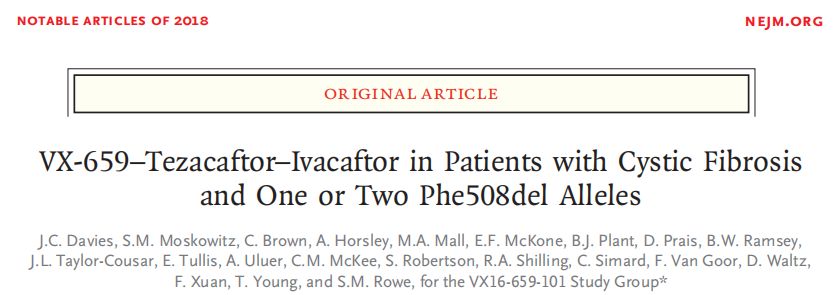 第九篇来自于阿拉巴马大学伯明翰分校,题为《VX-659–Tezacaftor–Ivacaftor in Patients with Cystic Fibrosis and One or Two Phe508del Alleles》该研究研究背景为新一代囊性纤维化跨膜传导调节剂(CFTR)校正剂VX-659与tezacaftor和ivacaftor (VX-659 - tezacaftor - ivacaftor)三联用,用于恢复f508del CFTR蛋白在囊性纤维化患者中的功能。