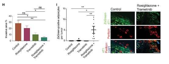 单独使用rosiglitazone的小鼠与对照组类似,肿瘤侵袭及其形态并没有太大改善,单独使用trametinib小鼠肿瘤组织明显缩小,肿瘤侵袭力明显减弱,但其作为一种上市的抗癌药产生如此疗效并不稀奇。而trametinib+rosiglitazone组,肿瘤组织明显弱小,侵袭力同样减弱,但随后的病理学分析结果令研究人员倍感惊喜:肿瘤细胞竟然真的转化成了脂肪细胞!