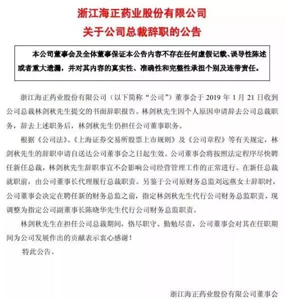 1月22日消息,近日海正药业董事会于2019年1月21日收到公司总裁林剑秋提交的书面辞职报告。辞去上述职务后,林剑秋仍担任公司董事职务。