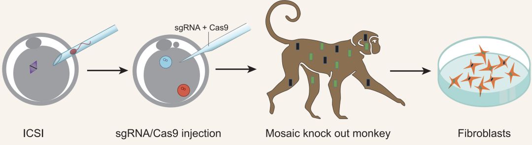 从BMAL1基因敲除猴中选取合适的成纤维细胞(图上),然后通过核移植技术最终获得五个BMAL1基因敲除克隆猴(图下)。图片引自NSR论文。