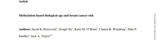近日,来自美国国家卫生研究院的科学家在线发表了一篇文章指出:基于DNA甲基化的生物年龄测量可能是乳腺癌风险重要的预测因子。该研究以“Methylation-based biological age and breast cancer risk. ”为题发表在《Journal of the National Cancer Institute》杂志上。