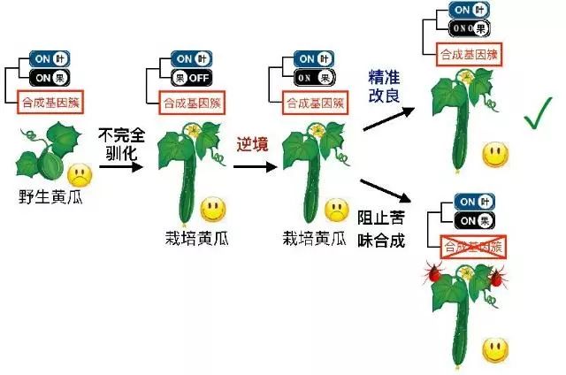 研究团队随后“顺藤摸瓜”,找到了控制黄瓜苦味合成和调控过程中的11个关键基因,其中9个基因负责苦味物质葫芦素的合成,另外两个基因Bl和Bt则被形象地定名为“主开关基因”,控制别的9个苦味合成基因表达与否,此中Bl基因负责控制叶片的苦味,Bt基因控制果实的苦味。“如果可以准确调节2个主开关基因的表达模式,就可以让黄瓜果实中不积聚苦味物质,让黄瓜口感好,同时还可以提高叶片中的葫芦素含量,用于抵御虫害,不用喷农药。”最终,黄三文团队把果实控制苦味物质合成的“开关”关上,不让黄瓜变苦;把叶片控制苦味物质合成的“开关”打开,让叶片苦来抵御虫害。
