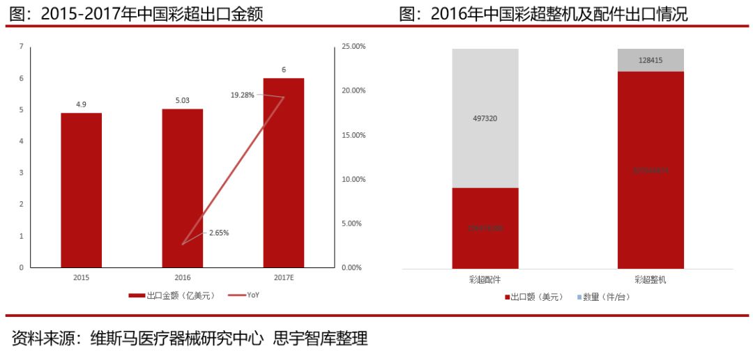 根据维斯马医疗器械研究中心数据显示,2015-2017年中国出口的彩超金额不断攀升,2016年彩超出口额达5.03亿美元(整机3.07亿美元,配件1.96亿美元),预计2017总额达到6亿美元,增速高达19.28%。