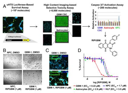 来自斯克里普斯研究中心的研究人员使用大规模筛选方法来鉴定诱导GBM CSC中细胞凋亡的药物样小分子。由于增殖性非干/多能GBM细胞的扩增种群用于此类筛选的用途十分有限,而使用培养的人肿瘤来源的GBM CSC的体外和体内临床前模型可更准确地囊括该疾病的生物学行为及其内在机制。因此,研究者通过源自患者的GBM CSC作为稳定细胞系扩增,并保持其体外分化潜能,进而对它们的体内植入,肿瘤形成和迁移潜力进行了相关研究
