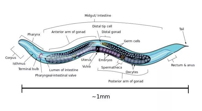 布伦纳回信中提到的虫子正是现在大家所熟悉的秀丽隐杆线虫(Caenorhab ditis elegans),秀丽隐杆线虫是这一届诺贝尔生理医学奖的真正明星,三位获奖者都以它为研究材料。而首创线虫研究,为分子生物学研究开辟一个全新领域的,正是布伦纳。布伦纳的研究特别关注秀丽隐杆线虫,并使其发展成为模式生物。
