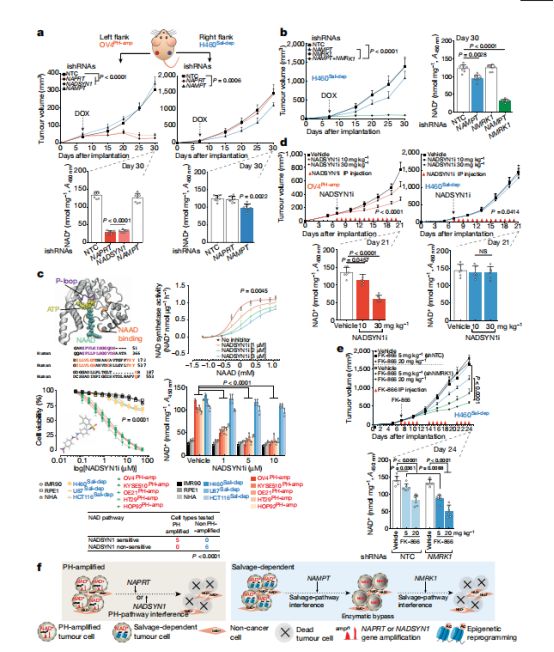 他们发现NAPRT酶是合成NAD的关键之一,NAPRT的表达水平决定了细胞是否通过NAPRT途径合成NAD。这条规律并不局限于正常细胞,来源于含高水平NAPRT的组织的癌细胞同样会大量表达这种酶,进而选择NAPRT途径合成NAD。