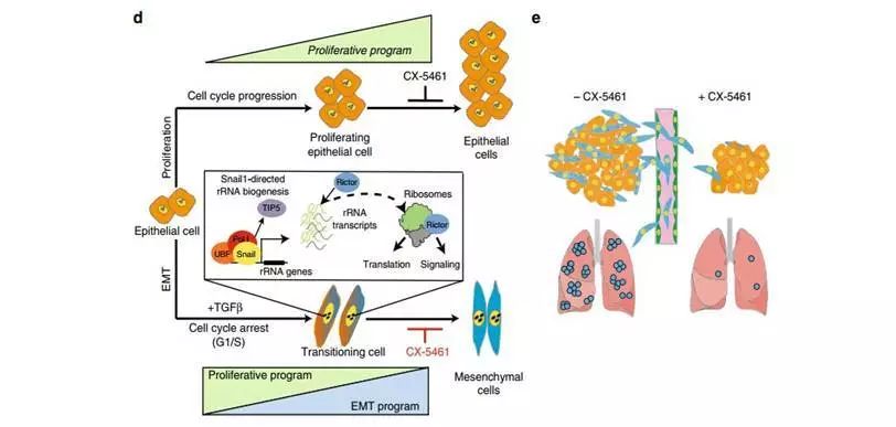 实践是检验真理的唯一标准,为了证明他们的观点,研究人员以小鼠为模型进行了实验。在本次研究中,他们还发现,与EMT相关的核糖体生物合成也与Rictor的核仁募集增加同时发生,Rictor是促进EMT的哺乳动物雷帕霉素复合物2靶标(mTORC2)的必需成分。因此,他们使用一种名为CX-5461的小分子抑制剂(mTORC2抑制剂)来阻止人类肿瘤小鼠模型中的核糖体生物发生。 结果发现,通过抑制新核糖体的形成,侵袭性和激素不敏感的肿瘤可以部分恢复为良性和非转移性类型。重要的是,CX -5461治疗也导致肺癌小鼠模型中肺癌细胞转移数量显着减少。