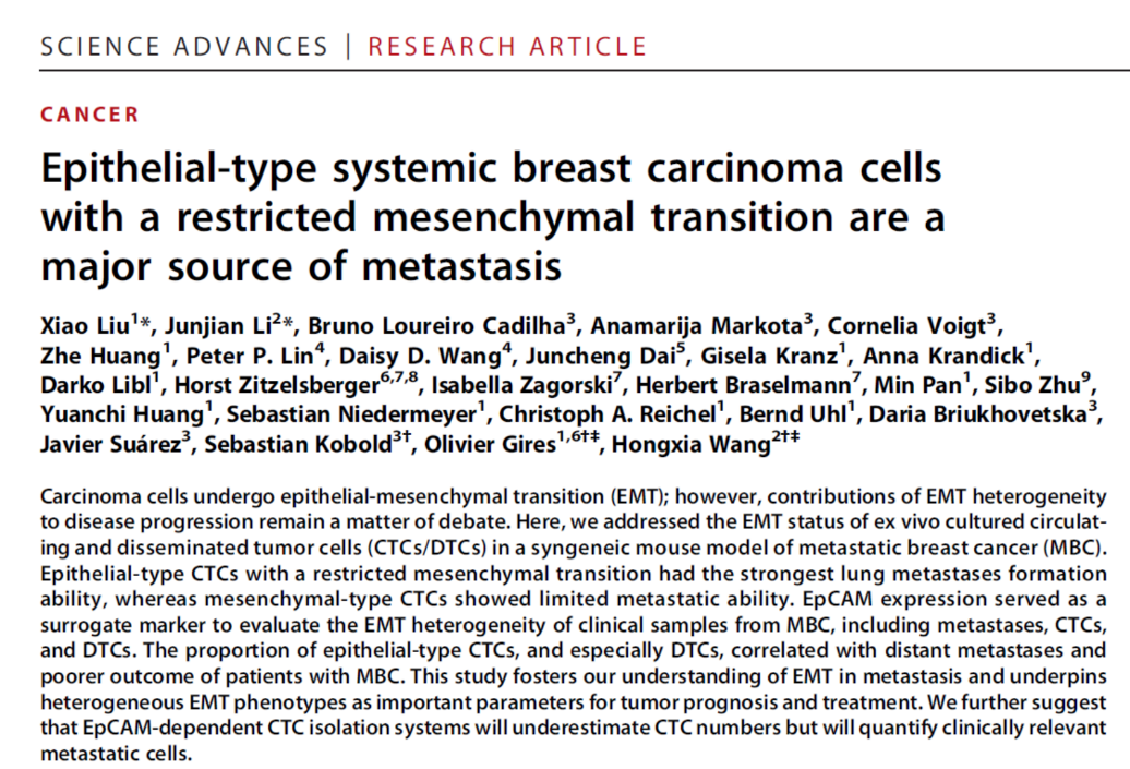 2019年6月20日,Science advances在线发表了上海市第一人民医院王红霞团队的研究成果“Epithelial-type systemic breast carcinoma cells with a restricted mesenchymal transition are a major source of metastasis”。研究表明肿瘤细胞EMT并非“全”或“无”的过程,更多肿瘤细胞处于EMT中间状态,呈现异质性特点;与间充质表型细胞(M,M/E)相比,以上皮细胞表型(E和E/M)为主细胞亚型具有更强的转移潜能;EPCAM+ CTCs和DTCs与远处转移及预后差显著相关。德国慕尼黑大学Olivier Gires为本文共同通讯作者。刘啸和李军建为共同第一作者。这篇文章同时被选为本期杂志的亮点文章(Highlight)。
