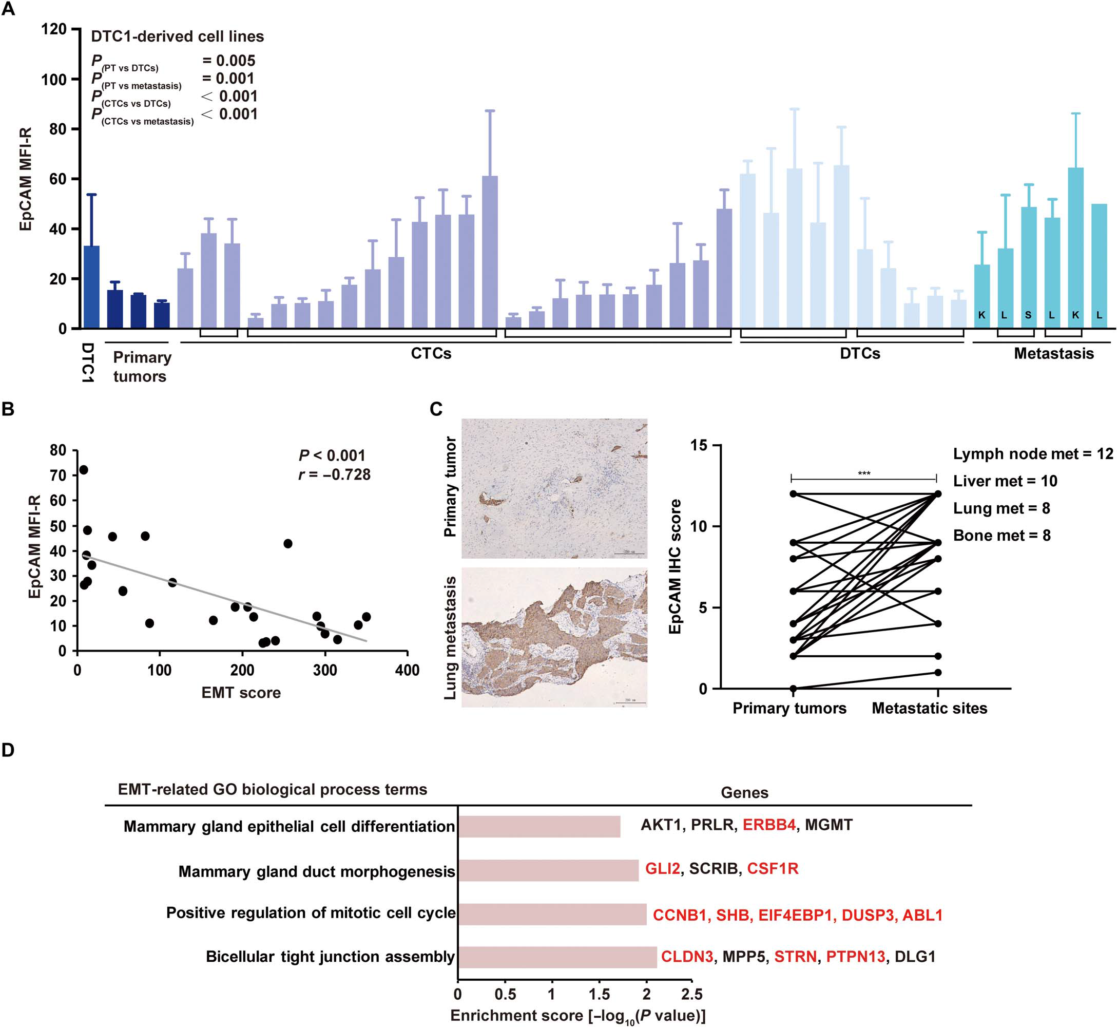 为验证EPCAM表达是否可作为有效的EMT临床样本检测替代标记,研究系统分析了 MBC模型中EPCAM表达与EMT表型的相关性,显示EPCAM强表达与较高EMT评分呈负相关(r=-0.728,p<0.001)。CTCs中EPCAM高水平表达与上皮表型相关。对乳腺癌术后原发肿瘤和相应淋巴结转移、肝转移、肺转移和骨转移标本IHC染色表明,与原发性肿瘤相比,转移病灶中EPCAM表达更高。进一步,研究人员通过差相富集与免疫荧光-染色体原位杂交(SE-iFISH)技术检测乳腺癌患者(III- IV期)CTCs和DTCs中EpCAM表达水平。采用单细胞DNA测序探寻EpCAM+和EpCAM− CTCs的全基因组拷贝数变化(CNVs),显示Tight junction (CLDN3, STRN, PTPN13), Mitotic cell cycle (CCNB1, SHB, EIF4EBP1, DUSP3, ABL1), Mammary gland epithelial cell differentiation (ERBB4)和Mammary gland duct morphogenesis (GLI2,CSF1R)等调控信号的基因扩增,提示EpCAM+ CTCs在细胞粘附、增殖和上皮分化能力的增强。对提取基因差异分析显示两组亚群细胞中存在ERK1和ERK2级联调控改变,而ERK(细胞外信号调节激酶)激活状态作为表皮生长因子受体信号的关键整合分子,在诱导细胞增殖或进入EMT过程中发挥重要调控作用。