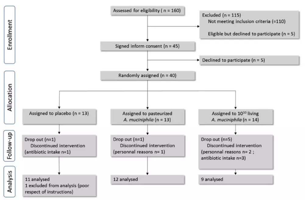 研究人员招募了32名志愿者参与这项研究。将志愿者随机分成3组(安慰剂,活细菌和巴氏杀菌细菌),并保持原有的饮食习惯或生活作息,采用Akkermansia作为营养补充剂。3个月后研究人员观察到,服用活菌或巴氏杀菌细菌的志愿者具有良好的顺应性(补充剂易于摄取)和耐受性(没有副作用),且与摄入安慰剂的受试者相比,摄入巴氏消毒细菌制剂的志愿者则出现了以下变化:胰岛素敏感度上升,胰岛素水平下降,肠道屏障和血液中的胆固醇水平有改善迹象。