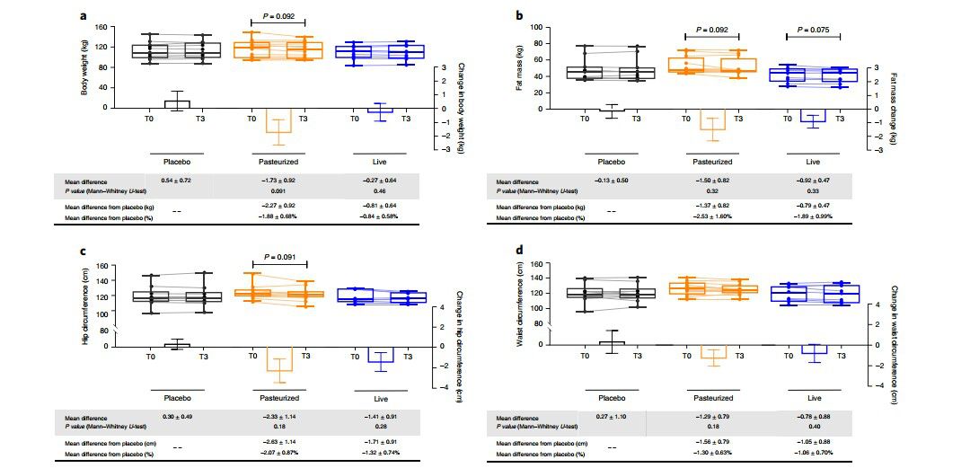 具体来说,摄入(巴氏消毒的)细菌的受试者的健康状况并没有恶化(其中包括糖尿病前期患者,及高心血管病风险的患者)。不仅如此,研究人员还观察到肝脏炎症标志物减少,受试者体重轻微下降(平均2.3公斤)以及胆固醇水平的降低。相反,摄入安慰剂志愿者的代谢指标(胰岛素抵抗或高胆固醇血症)则随着时间的推移继续恶化。