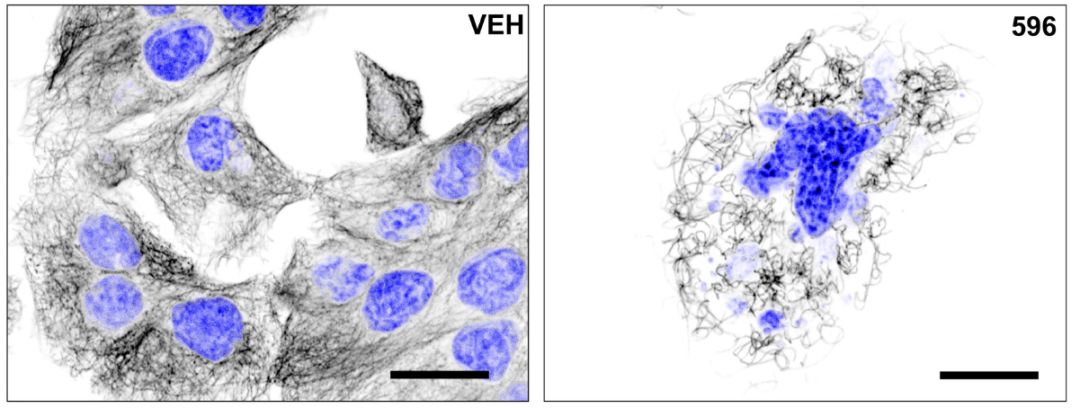 PTC596抑制微管蛋白聚合(左图为对照veh,右图为PTC596处理)