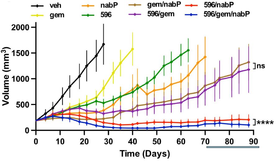 PTC596(596)和紫杉醇(nabP)联合使用具有协同效果。图示为不同药物及药物联合条件下胰腺癌PDX模型肿瘤大小变化(veh为对照组)
