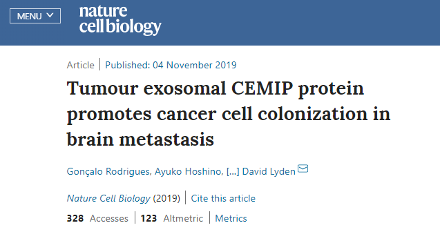Gonçalo Rodrigues,et al.Tumour exosomal CEMIP protein promotes cancer cell colonization in brain metastasis.Nature Cell Biology (2019).