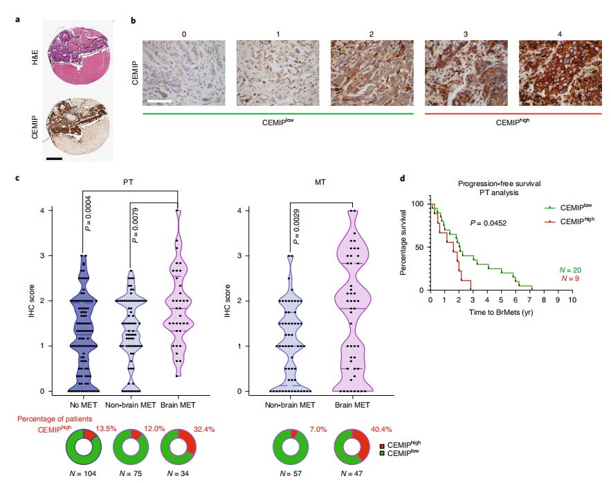 CEMIP是一种可通过协调Wnt通路积极调节上皮-间质转化(EMT),进而调节肿瘤细胞的生长,侵袭和癌症扩散的蛋白。研究人员发现,脑转移瘤细胞中的CEMIP浓度明显高于其他转移瘤,抑制大脑中CEMIP的表达可以显著改善肿瘤脑转移,而这个过程可以通过恢复CEMIP表达被逆转。也就是说,CEMIP对肿瘤脑转移有着重要的正向作用。