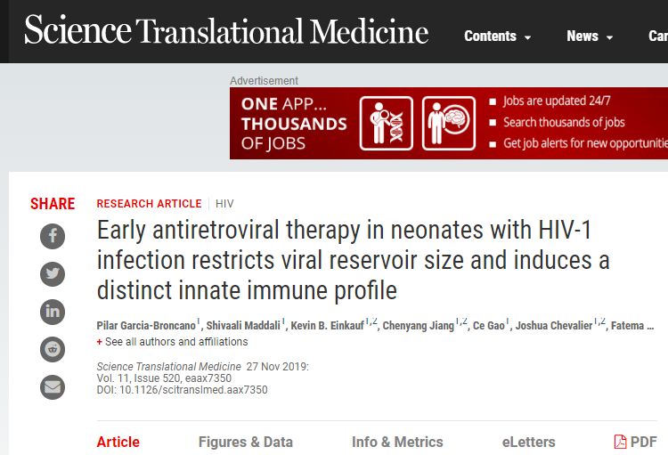 Pilar Garcia-Broncano,et al.Early antiretroviral therapy in neonates with HIV-1 infection restricts viral reservoir size and induces a distinct innate immune profile.cience Translational Medicine 27 Nov 2019.