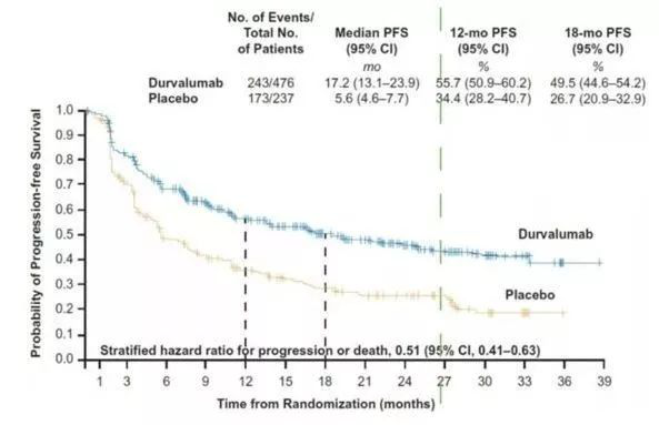 III期肺癌:Imfinzi的应许之地Imfinzi此次获批的III期非小细胞肺癌其实是肺癌领域非常细分的一个市场。但是恰恰正是因为一开始就锚定了这个细分市场,I药才得以在激烈的市场竞争中占据了自己的一席之地。?从病情严重程度上,肺癌可以分为I期、II期、III期、IV期。I期和II期肺癌都处于病情的早期阶段癌细胞没有扩散,手术切除肺部肿瘤块+化放疗等就是非常有效的治疗方案,临床上以治愈为目标。I期肺癌的5年生存率可以达到70%-90%,II期肺癌的5年生存率可以达到50%-70%。而到了IV期肺癌阶段,癌细胞出现向胸腔之外的远端扩散,比如转移至远端淋巴结、肝脏、骨骼或脑,已经无法手术,临床上治愈可能性较低,通常以延长生存期改善生活质量为目标。IV期肺癌的5年生存率只有5%左右。?III期肺癌,癌细胞虽然出现扩散但仍局限在胸腔内,会扩散转移至胸腔其他部位的淋巴结或胸腔内的其他主要器官,因此III期肺癌也被称为局部晚期肺癌。虽然III期肺癌很难通过手术清除所有癌细胞,但是相比IV期肺癌仍有较大希望治愈。过去很长时间内,III期肺癌的标准治疗是同步放化疗,但效果不如人意。基于1999-2010年的美国NSCLC生存数据,IIIA~IIIC期患者的5年生存率分别约为36%,26%和13%。?Imfinzi用于III期肺癌在临床数据上显示出了巨大的优势。在代号为PACIFIC的III期多中心随机、双盲、安慰剂对照的试验中,III期肺癌患者采用同步放化疗之后,给予一年的Imfinzi巩固治疗,可以将标准治疗的中位PFS从5.6个月显著延长至17.2个月,将18个月无进展生存率从26.7%提高到49.5%,把III期患者发生远端转移的时间从16.2个月延长到到28.3个月,将疾病进展推迟将近1年的时间,同时,死亡风险也降低了32%!?