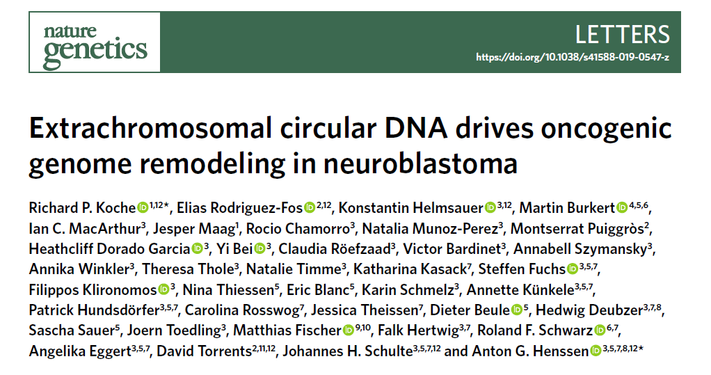 Koche, R.P., Rodriguez-Fos, E., Helmsauer, K. et al. Extrachromosomal circular DNA drives oncogenic genome remodeling in neuroblastoma. Nat Genet (2019)