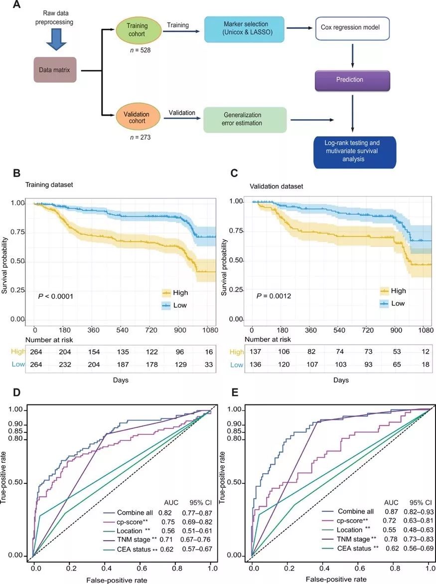 进而,研究者对900多名受试者进行为期平均26.6个月的跟踪调查,结合肠镜和cfDNA甲基化数据,判别5个与结直肠癌预后有关的标志物;即通过对这些标志性甲基化位点的cp-score评分,几乎能准确推测出患者的生存率,远远优于临床常用的肿瘤原发部位、TMN分期、CEA等预后指标。