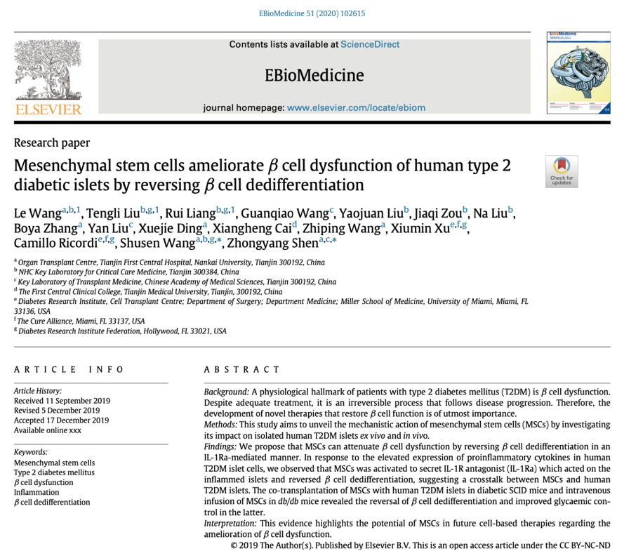 近日,天津市第一中心医院移植中心沈中阳教授团队的一项成果发表于柳叶刀子刊《EBioMedicine》杂志上。该研究揭示间充质干细胞能够逆转2型糖尿病人胰岛的去分化,修复病态胰岛。这项研究为间充质干细胞治疗糖尿病提供了全新且强有力的证据。