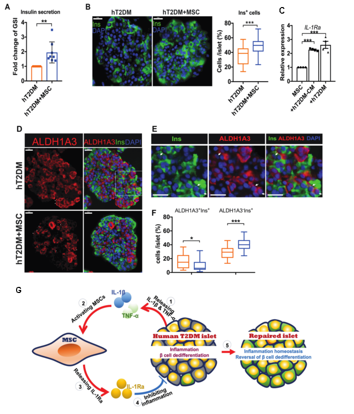 MSC与2型糖尿病胰岛共培养提高其葡萄糖刺激的胰岛素分泌能力(A),增加其胰岛素阳性的细胞比例(B)。2型糖尿病胰岛(hT2DM)及其条件培养基(hT2DM-CM)反之刺激MSC表达IL-1Ra基因。MSC与2型糖尿病胰岛共培养逆转β 细胞去分化(D-F)。分子机制研究显示,高炎的2型糖尿病胰岛分泌IL-1β和TNF-α,刺激MSC分泌IL-1Ra,IL-1Ra抑制胰岛炎症,从而逆转2型糖尿病胰岛中的β细胞去分化,修复胰岛功能(G)。(转化医学网360zhyx.com)