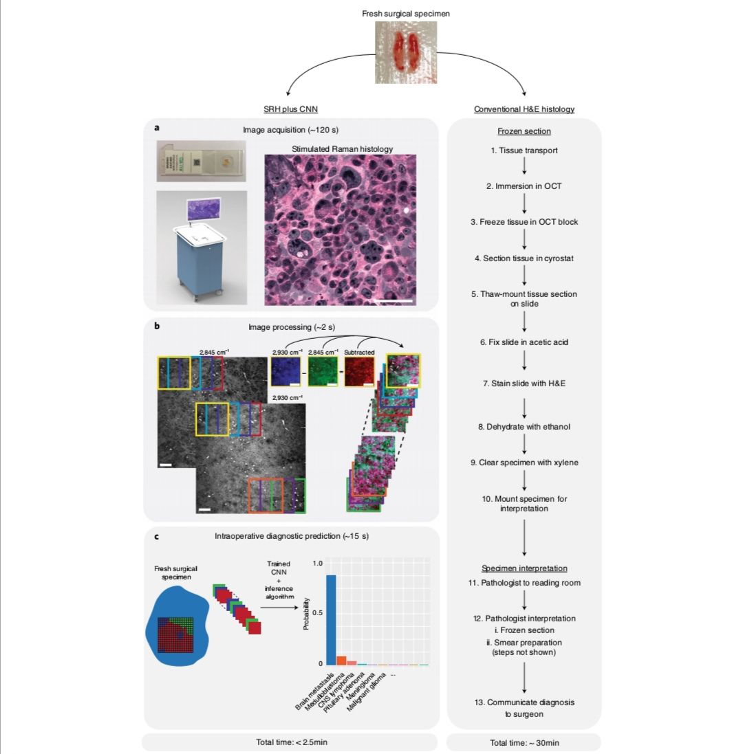 这项新技术是由受激拉曼组织学(SRH)联合无标签光学成像和深度卷积神经网络进行的,而SRH是在受激拉曼散射显微镜的基础上进行的,该显微镜开发于2008年,可快速、精准探测脑瘤组织,从而帮助外科医生更加安全、有效地实施切除手术。