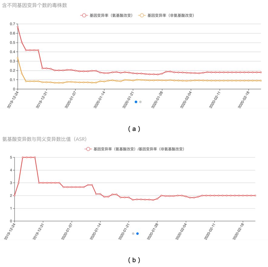 图五(a) 基因变异率分析:该曲线图展示了氨基酸改变的基因变异率和非氨基酸改变的基因变异率分别随着时间变化的趋势。红色曲线是表示氨基酸改变的基因变异变异率,黄色曲线表示非氨基酸改变的基因变异率;(b)氨基酸变异数与同义变异数比值(ASR):该曲线图展示了氨基酸改变和非氨基酸改变的基因变异数目比值(ASR = Amino Acid Change# to Synonymous Ratio#)随时间变化的趋势。