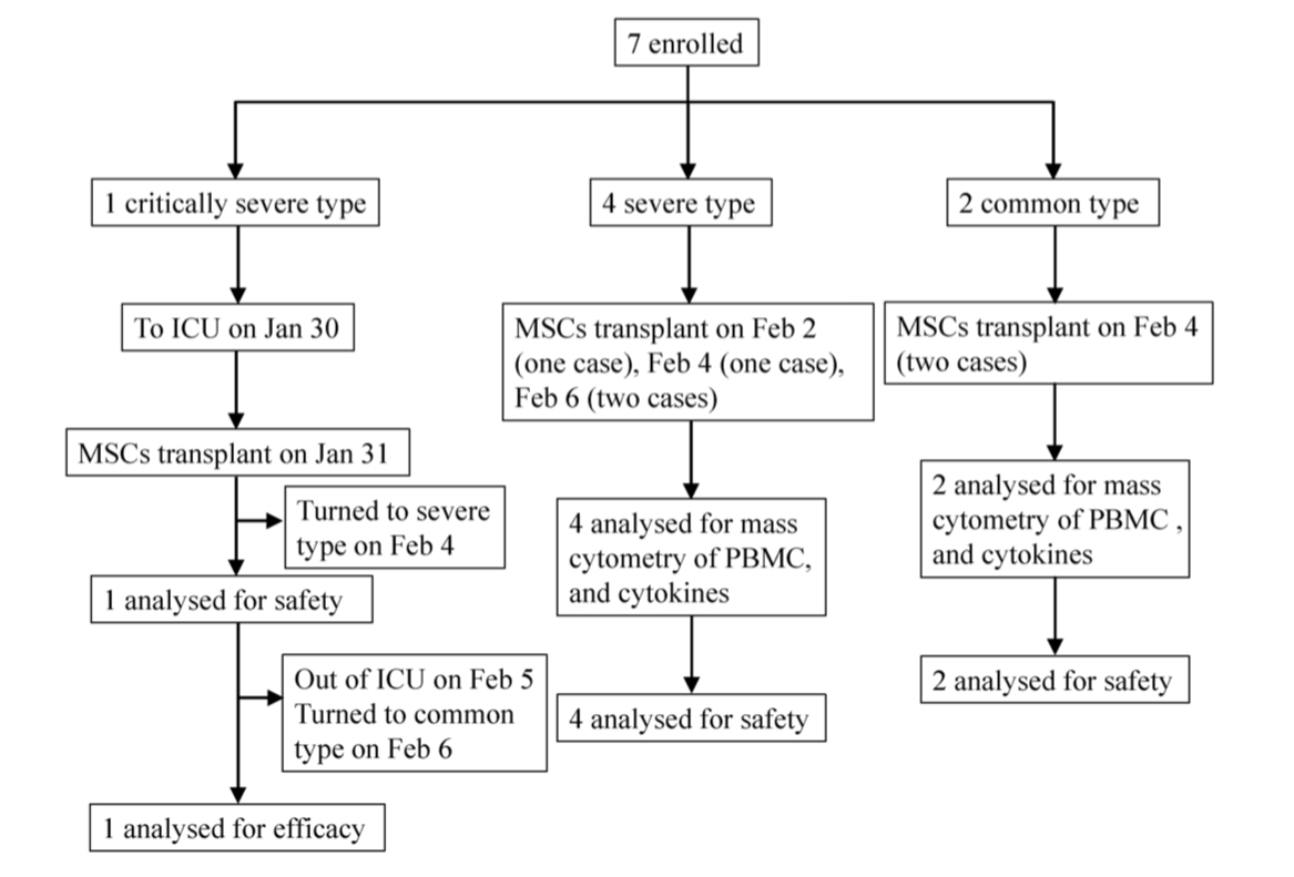 在2020年1月23日至2月16日期间,研究者共征集了首都医科大学附属北京安佑医院的7名COVID-19患者,其中包括1名危重症患者、4名重症患者和2名轻症患者,探究间充质干细胞移植后14天内,患者的免疫系统和炎症系统功能变化,以及副作用的发生情况。