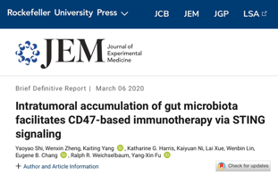 Yaoyao Shi, et al. Intratumoralaccumulation of gut microbiota facilitates CD47-based immunotherapy via STING signaling. JEM. 06 Mar, 2020.