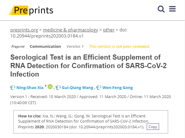 Ningshao Xia et al. Serological test is an efficient supplement of RNA detection for confirmation of SARS-CoV-2 infection. Preprints. 10 March, 2020.