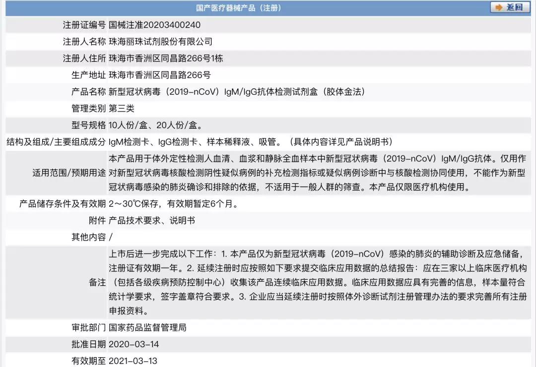 珠海丽珠试剂股份有限公司新型冠状病毒(2019-nCoV)IgM / IgG抗体检测试剂盒(胶体金法)产品