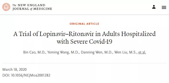 【2】Bin Cao et al. A Trial of Lopinavir–Ritonavir in Adults Hospitalized with Severe Covid-19,New England Journal of Medicine(2020).  DOI:10.1056/NEJMoa2001282