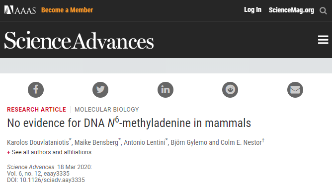 这组作者写道:“我们证明,RNA和细菌污染、抗体交叉反应性和其他技术限制的结合已导致6mdA在哺乳动物DNA中的反复错误识别。随着DNA和RNA修饰家族的不断增长,以及以前未知修饰的丰富性越来越罕见,即使使用多种互补方法,我们也强调了错误发现的可能性。我们建议使用修饰和未修饰的基因组DNA标准作为今后对稀有DNA修饰的研究的最低要求,以及在使用前更全面地验证抗体特异性。”