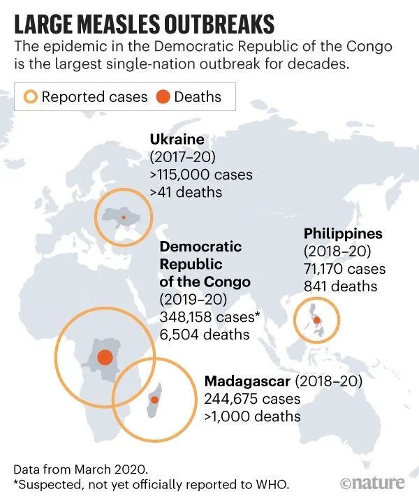 据世卫组织估计,已有348,000多例病例和6,500例死亡,但巴黎无国界医生组织(MSF)Epicentre研究机构的流行病学家Francisco Luquero认为疫情要严重得多。他说,病例数仅反映去医疗中心的人数。至于死亡率估计,他们仅计算了麻疹病例后立即发生的死亡,而不是五年以内的。由于免疫失忆,疫情将对公共卫生产生深远影响。