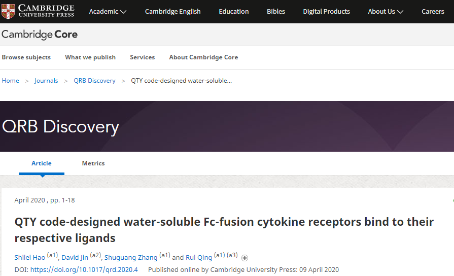 Shilei Hao et al. QTY code-designed water-soluble Fc-fusion cytokine receptors bind to their respective ligands, QRB Discovery (2020). DOI: 10.1017/qrd.2020.4