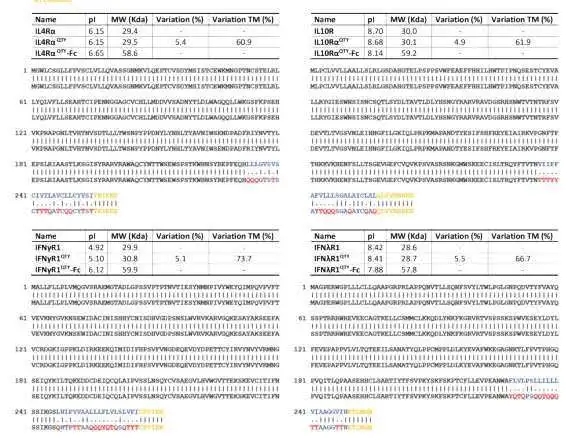 与趋化因子受体类似,QTY码仅适用于这些受体的跨膜结构域,如图1所示。选择红色氨基酸交换以消除设计受体中的疏水斑。细胞外结构域和细胞内连接体都没有受到影响。干扰素和白细胞介素受体的分子量变化很小。